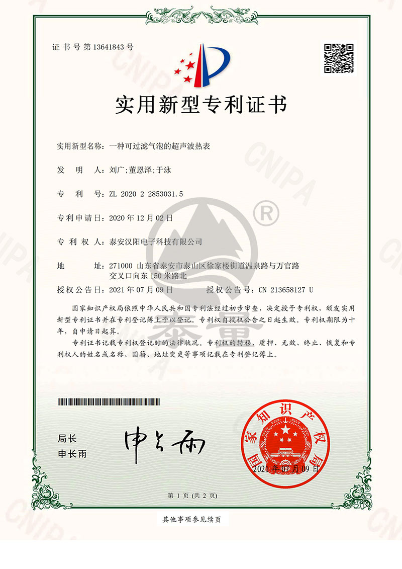 FZ20-548一種可過濾氣泡的超聲波熱表-證書